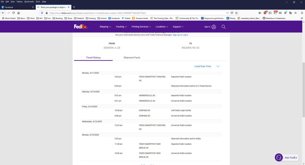 It’s been rather amusing watching the gyrations that a package that was shipped to me via “FedEx Smartpost” has gone through. This is the shipping service where FedEx supposedly moves it most of the way and then has the USPS do the “last mile” delivery.