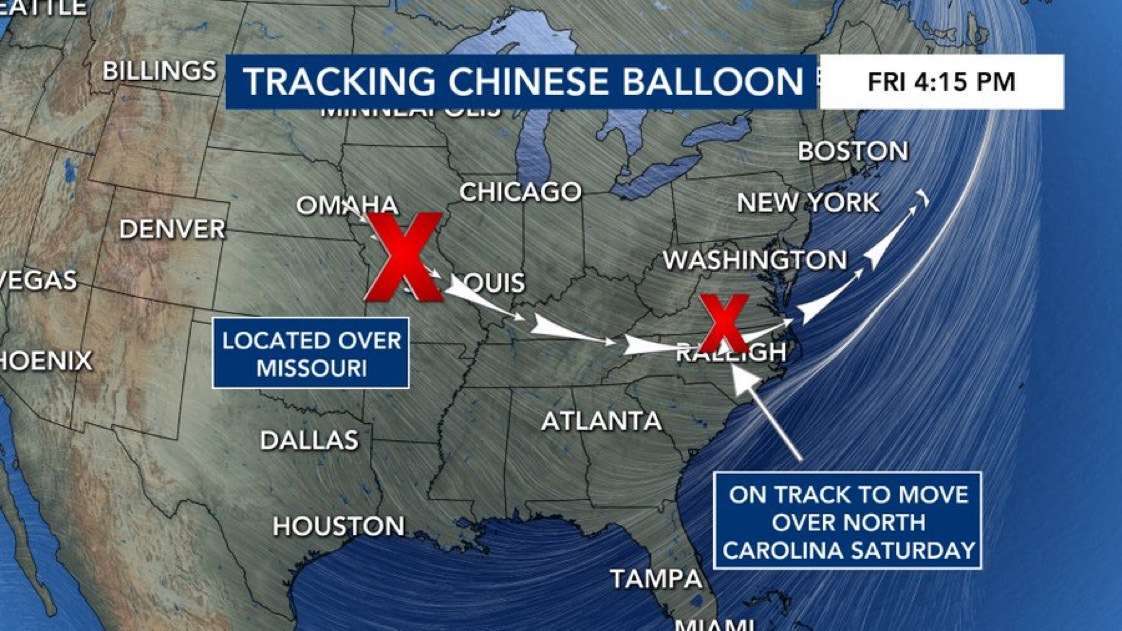 For the last few days, a Chinese balloon the size of three buses with a instrument package with solar panels dangling below it has been drifting over the continental United States and has made it’s way from Montana to Missouri and is now hovering over western North Carolina.