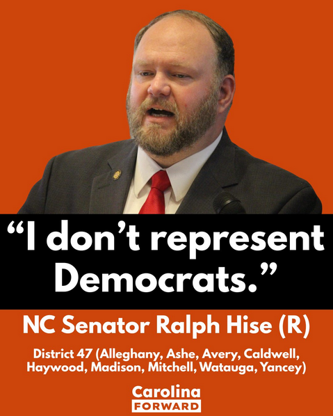 - Senator Hise – I do not represent Democrats in the Senate. I represent nine counties in Western North Carolina. But no there were no Democrats involved in the drawing.